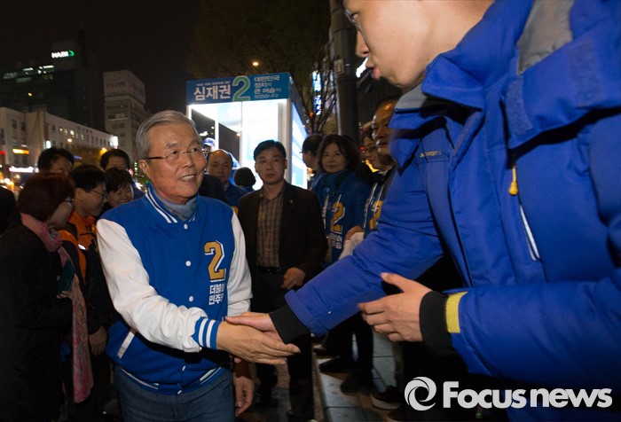 (서울=포커스뉴스) 6일 오후 서울 강동구 이마트 앞에서 김종인 더불어민주당 비대위 대표가 심재권 후보와 함께 유세를 펼치고 있다.
