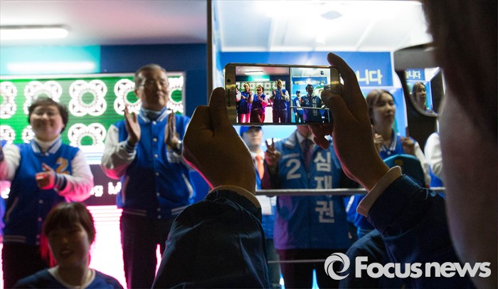 (서울=포커스뉴스) 6일 오후 서울 강동구 이마트 앞에서 김종인 더불어민주당 비대위 대표가 심재권 후보와 함께 유세를 펼치고 있다.