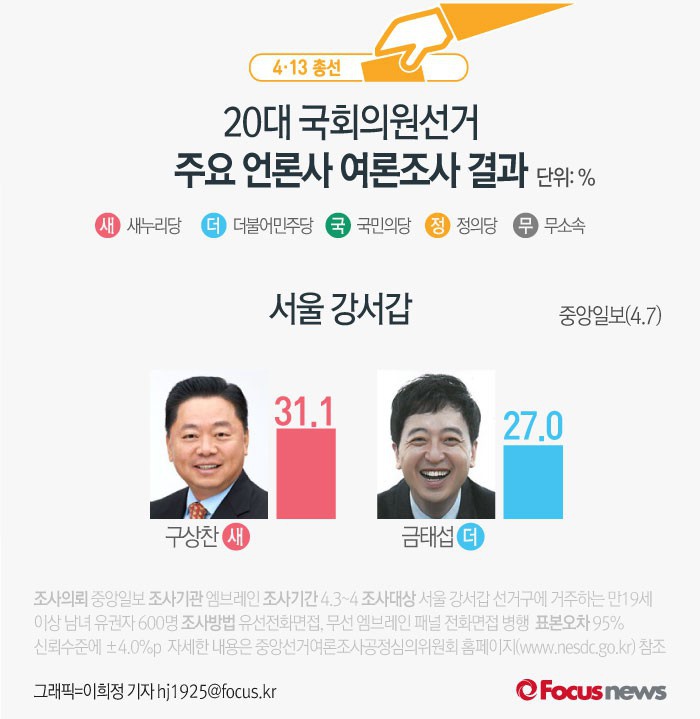 (서울=포커스뉴스) 중앙일보가 엠브레인에 의뢰해 7일 발표한 서울 강서갑 여론조사 결과에 따르면 새누리당 구상찬 후보의 지지율은 31.1%, 더불어민주당 금태섭 후보의 지지율은 27.0%로 나타났다.