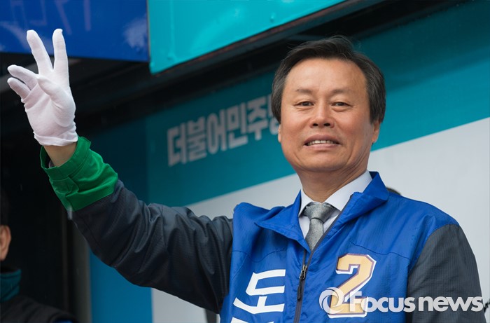 (청주=포커스뉴스) 7일 오전 충북 청주시 흥덕구 복대사거리에서 도종환 더불어민주당 후보가 출근길 시민들에게 인사를 하며 지지를 호소하고 있다.