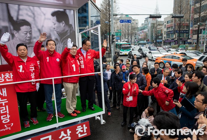 (서울=포커스뉴스) 7일 오전 서울 강서구 화곡역 사거리에서 강서구갑ㆍ을ㆍ병 후보 합동 지원유세에 나선 김무성 새누리당 대표가 후보들과 함께 유권자들에게 지지를 호소하고 있다.