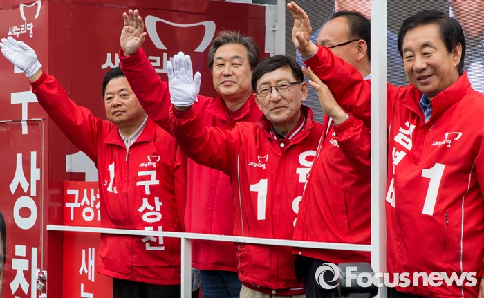 (서울=포커스뉴스) 7일 오전 서울 강서구 화곡역 사거리에서 강서구갑ㆍ을ㆍ병 후보 합동 지원유세에 나선 김무성(왼쪽 두번째) 새누리당 대표가 후보들과 함께 유권자들에게 지지를 호소하고 있다.