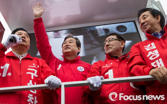 (서울=포커스뉴스) 7일 오전 서울 강서구 화곡역 사거리에서 강서구갑ㆍ을ㆍ병 후보 합동 지원유세에 나선 김무성(왼쪽 두 번째) 새누리당 대표가 후보들과 함께 유권자들에게 지지를 호소하고 있다.