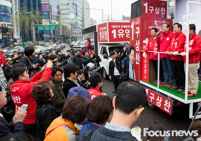 (서울=포커스뉴스) 7일 오전 서울 강서구 화곡역 사거리에서 강서구갑ㆍ을ㆍ병 후보 합동 지원유세에 나선 김무성 새누리당 대표가 후보들과 함께 유권자들에게 지지를 호소하고 있다.