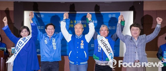 (남양주=포커스뉴스) 7일 오전 경기도 남양주시청에서 공동정책 공약 발표에 앞서 최민희(왼쪽부터) 더불어민주당 남양주병 후보, 김한정 더불어민주당 남양주을 후보, 김종인 더불어민주당 비대위 대표, 조응천 더불어민주당 남양주갑 후보, 최재성 의원이 기념촬영을 하고 있다.