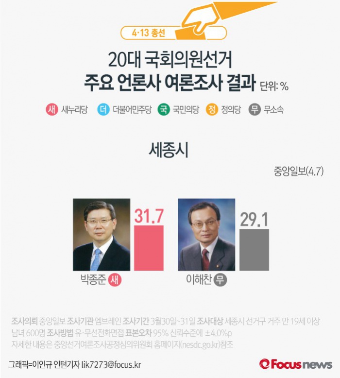 (서울=포커스뉴스) 중앙일보가 여론조사기관 엠브레인에 의뢰해 7일 발표한 결과에 따르면 세종시에서 새누리당 박종준 후보의 지지율은 31.7%, 무소속 이해찬 후보의 지지율은 29.1%인 것으로 나타났다.
