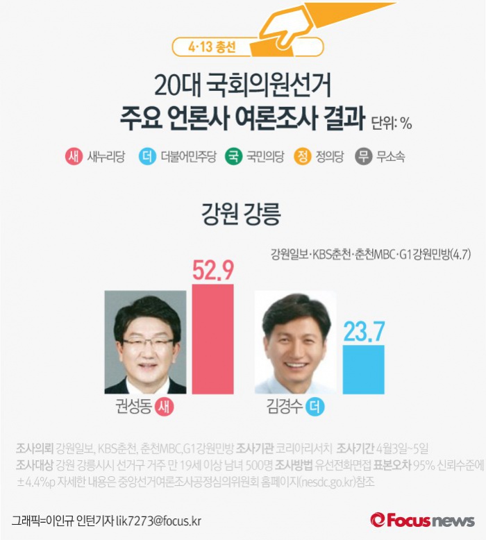 (서울=포커스뉴스) 강원일보·KBS춘천·춘천MBC·G1강원민방이 여론조사기관 코리아리서치에 의뢰해 7일 발표한 결과에 따르면 강원 강릉에서 새누리당 권성동 후보의 지지율은 52.9%, 더불어민주당 김경수 후보의 지지율은 23.7%인 것으로 나타났다.