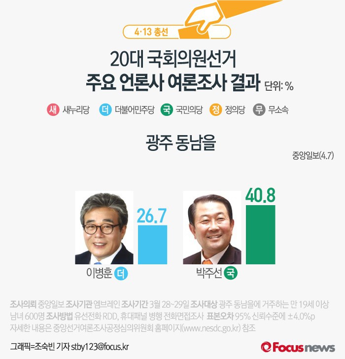 (서울=포커스뉴스) 4·13 총선이 일주일도 남지 않은 가운데 광주 동남을에 출마한 박주선 국민의당 후보가 이병훈 더불어민주당 후보에 10%p 이상 차로 앞서고 있는 것으로 나타났다.