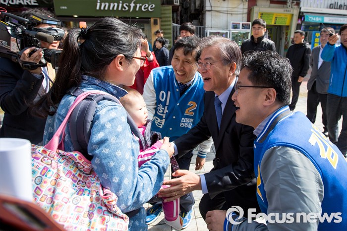 (군포=포커스뉴스) 문재인 더불어민주당 전 대표가 7일 오전 경기도 군포시 산본중심상가를 방문해 이학영 군포시을 후보, 김정우 군포시갑 후보와 함께 유권자들에게 한 표를 호소 하고 있다.