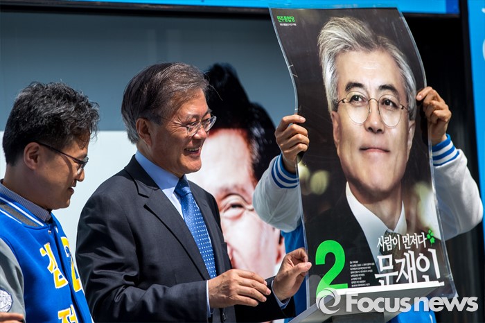 (군포=포커스뉴스) 문재인 더불어민주당 전 대표가 7일 오전 경기도 군포시 산본중심상가를 방문해 유권자들에게 이학영 군포시을 후보, 김정우 군포시갑 후보 지지 연설을 마친 뒤 한 지지자가 가져온 지난 대통령 선거 포스터를 보고 있다.
