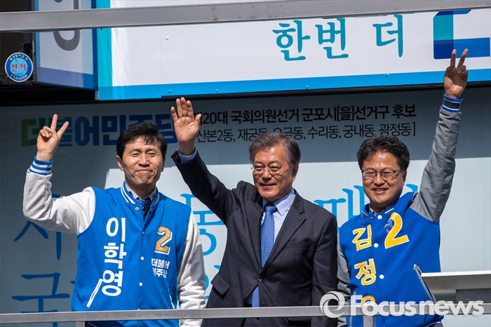 (군포=포커스뉴스) 문재인 더불어민주당 전 대표가 7일 오전 경기도 군포시 산본중심상가를 방문해 이학영 군포시을 후보, 김정우 군포시갑 후보와 함께 유권자들에게 한 표를 호소 하고 있다.