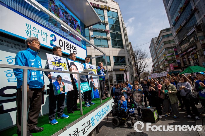 (군포=포커스뉴스) 문재인 더불어민주당 전 대표가 7일 오전 경기도 군포시 산본중심상가를 방문해 이학영 군포시을 후보, 김정우 군포시갑 후보와 함께 유권자들에게 투표 참여를 촉구하고 있다.