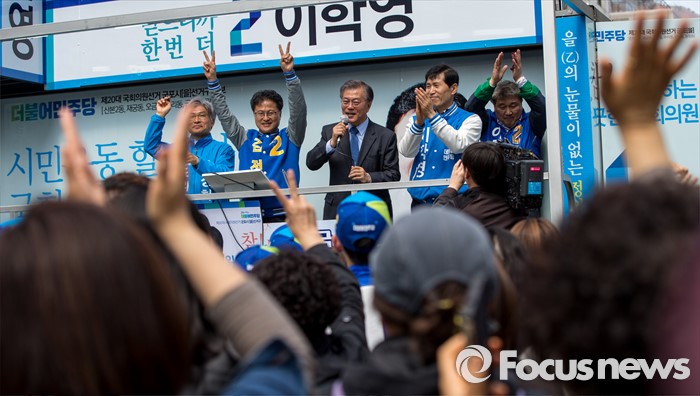 (군포=포커스뉴스) 문재인 더불어민주당 전 대표가 7일 오전 경기도 군포시 산본중심상가를 방문해 유권자들에게 이학영 군포시을 후보, 김정우 군포시갑 후보 지지를 호소 하고 있다.