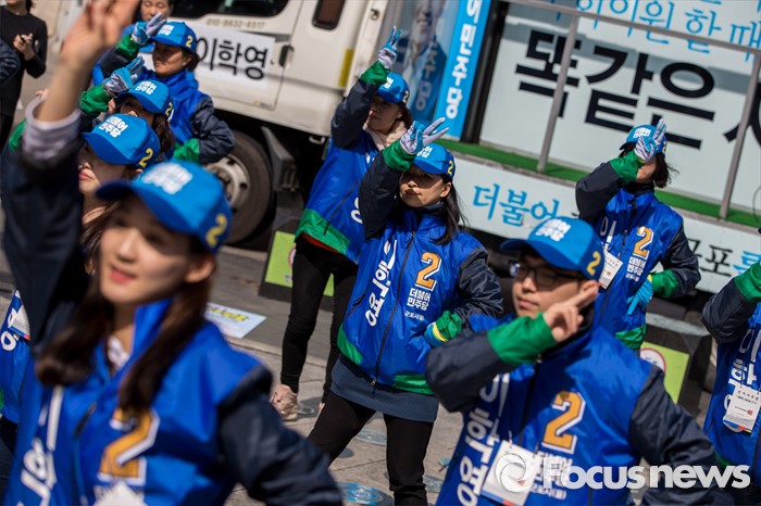 (군포=포커스뉴스) 이학영 더불어민주당 군포시을 후보 선거운동원들이 7일 오전 경기도 군포시 산본중심상가에서 선거운동을 하고 있다.