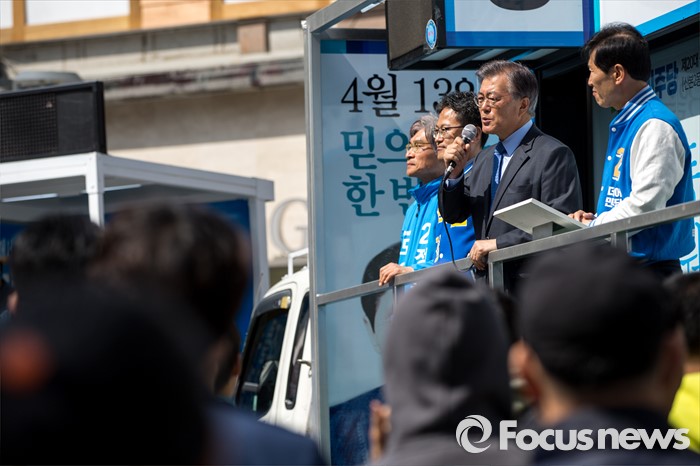 (군포=포커스뉴스) 문재인 더불어민주당 전 대표가 7일 오전 경기도 군포시 산본중심상가를 방문해 유권자들에게 이학영 군포시을 후보, 김정우 군포시갑 후보 지지를 호소 하고 있다.