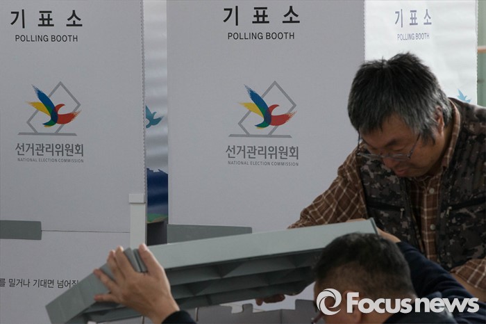 (서울=포커스뉴스) 20대 총선을 6일 앞둔 7일 오전 서울 용산구 서울역 3층 맞이방에 사전투표소가 설치되고 있다.