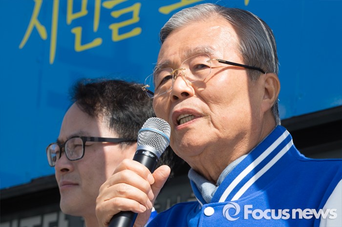 (춘천=포커스뉴스) 7일 강원도 춘천풍물시장 인근에서 김종인 더불어민주당 비대위 대표와 허영 더불어민주당 춘천 후보가 유세를 펼치며 포옹을 하고 있다.