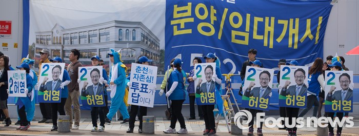 (춘천=포커스뉴스) 7일 강원도 춘천풍물시장 인근에서 선거운동원들이 유권자들에게 허영 더불어민주당 춘천 후보의 지지를 호소하고 있다.