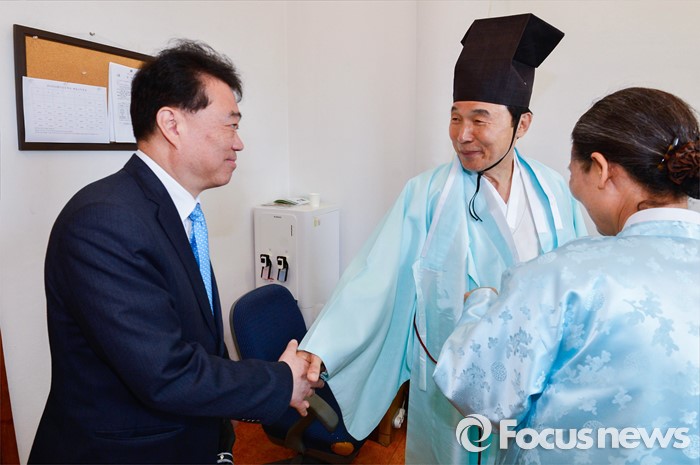 (남양주=포커스뉴스) 손학규(오른쪽) 전 더불어민주당 상임고문이 7일 오전 경기 남양주 다산유적지에서 열린 다산 정약용 선생 180주기 묘제에 초헌관으로 참석한 뒤 김성수 당 대변인과 인사하고 있다. 이날 김종인 비대위 대표 겸 선대위원장은 손 전 상임고문의 20대 총선 지원을 공식 요청했다.