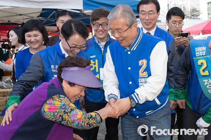 (춘천=포커스뉴스) 7일 강원도 춘천풍물시장 인근에서 김종인 더불어민주당 비대위 대표와 허영 더불어민주당 춘천 후보가 유권자들에게 지지를 호소하고 있다.