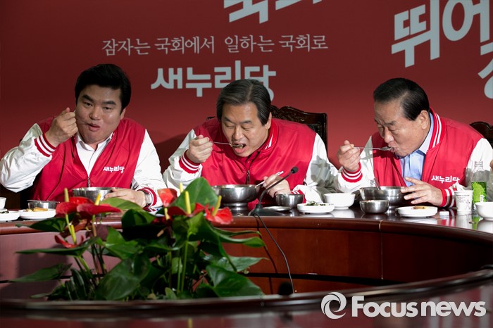 (서울=포커스뉴스) 7일 오전 서울 여의도 새누리당사에서 김무성(가운데) 대표와 원유철(왼쪽) 원내대표, 서청원 최고위원이 공동선대위원장 긴급회의에 참석해, 비빔밥을 먹고 있다.