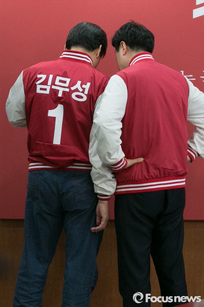 (서울=포커스뉴스) 김무성(왼쪽) 새누리당 대표와 안형환 중앙선대위 대변인이 7일 오전 서울 여의도 당사에서 열린 공동선대위원장 긴급회의에 참석해 대화하고 있다.