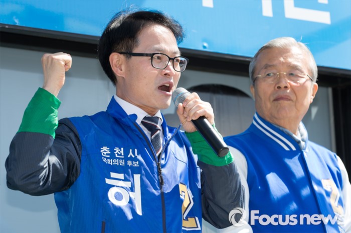 (춘천=포커스뉴스) 7일 강원도 춘천풍물시장 인근에서 김종인 더불어민주당 비대위 대표와 허영 더불어민주당 춘천 후보가 유권자들에게 지지를 호소하고 있다.
