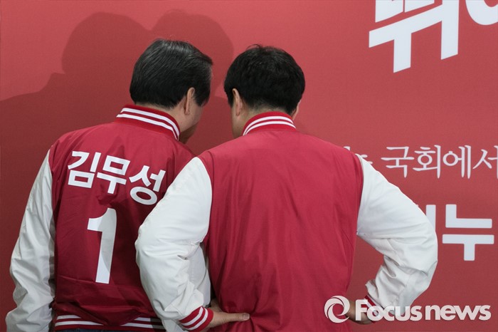(서울=포커스뉴스) 김무성(왼쪽) 새누리당 대표와 안형환 중앙선대위 대변인이 7일 오전 서울 여의도 당사에서 열린 공동선대위원장 긴급회의에 참석해 대화하고 있다.