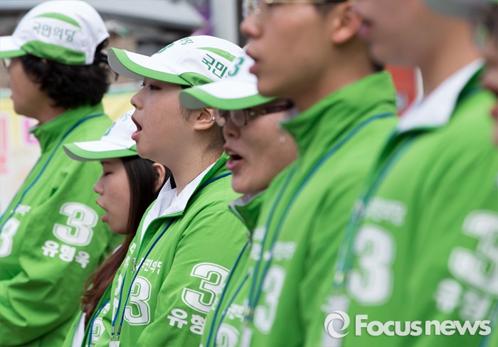 (하남=포커스뉴스) 7일 오후 경기 하남 신장시장 앞에서 유형욱 국민의당 하남시 후보 선거운동원들이 지지를 호소하고 있다.