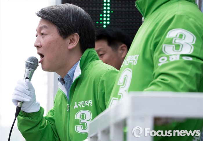 (하남=포커스뉴스) 7일 오후 경기 하남 신장시장 앞에서 안철수 국민의당 상임공동대표가 유형욱 국민의당 하남시 후보 지원유세를 하고 있다.