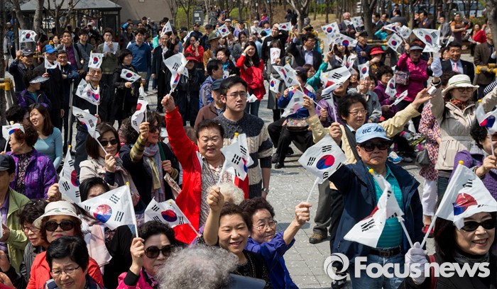 (서울=포커스뉴스) 7일 오후 서울 마포구 늘장공원에서 열린 안대희 새누리당 마포갑 후보 집중유세장에 모인 시민들이 태극기를 흔들며 지지를 보내고 있다.