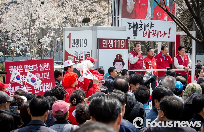 (서울=포커스뉴스) 7일 오후 서울 마포구 늘장공원에서 열린 안대희 새누리당 마포갑 후보 집중유세에 참석한 김무성 대표와 안 후보, 서청원 최고위원, 원유철 원내대표가 유권자들의 지지를 호소하고 있다.