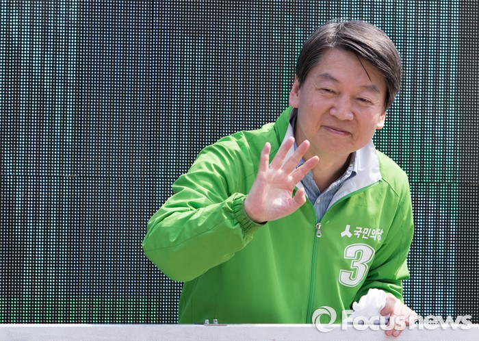 (하남=포커스뉴스) 7일 오후 경기 하남 신장시장 앞에서 안철수 국민의당 상임공동대표가 유형욱 국민의당 하남시 후보 지원유세를 하고 있다.