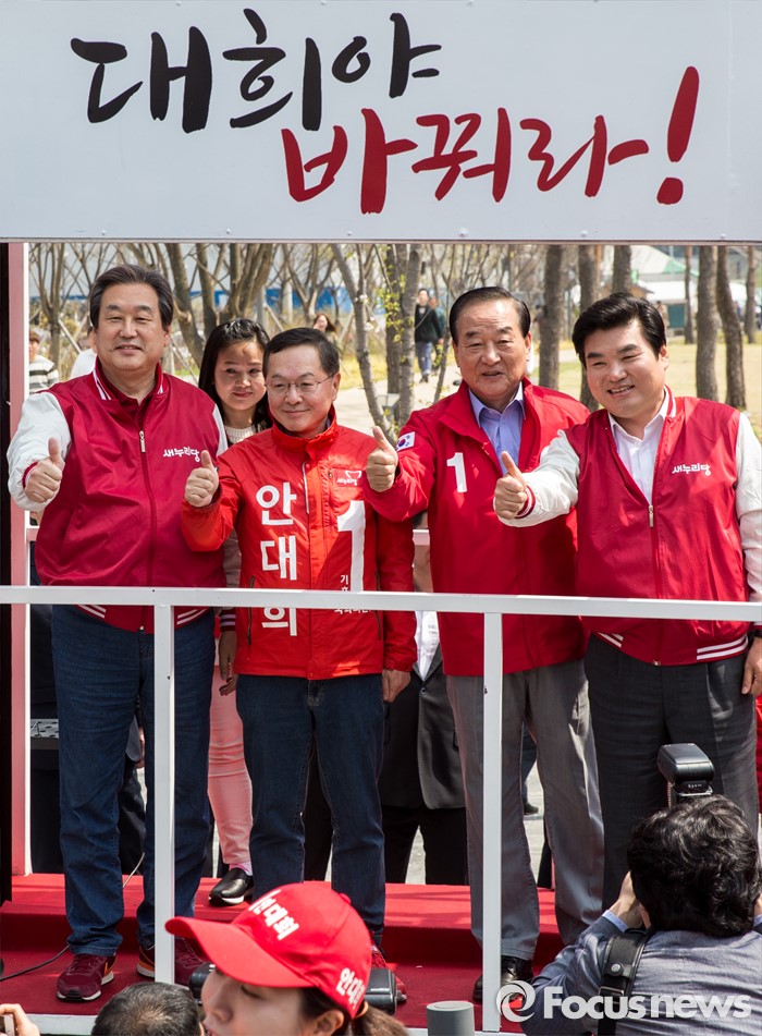 (서울=포커스뉴스) 7일 오후 서울 마포구 늘장공원에서 열린 안대희 새누리당 마포갑 후보 집중유세에 참석한 김무성 대표와 안 후보, 서청원 최고위원, 원유철 원내대표가 유권자들의 지지를 호소하고 있다.