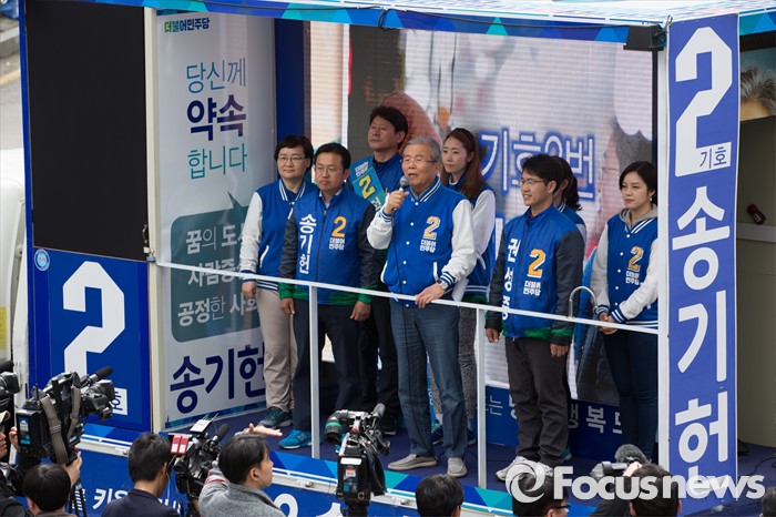 (원주=포커스뉴스) 7일 오후 강원도 원주중앙시장 인근에서 송기헌 더불어민주당 원주을 후보, 김종인 더불어민주당 비대위 대표, 권성중 더불어민주당 원주갑 후보가 유권자들에게 지지를 호소하고 있다.