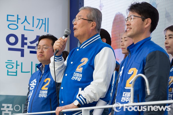 (원주=포커스뉴스) 7일 오후 강원도 원주중앙시장 인근에서 송기헌 더불어민주당 원주을 후보, 김종인 더불어민주당 비대위 대표, 권성중 더불어민주당 원주갑 후보가 유권자들에게 지지를 호소하고 있다.