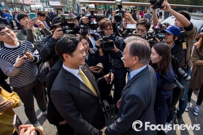(인천=포커스뉴스) 문재인 더불어민주당 전 대표가 7일 오후 인천광역시 지하철1호선 주안역 남광장에서 열린 인천 지역 후보 합동유세를 마친 뒤 김광진 더불어민주당 의원과 대화를 나누고 있다.