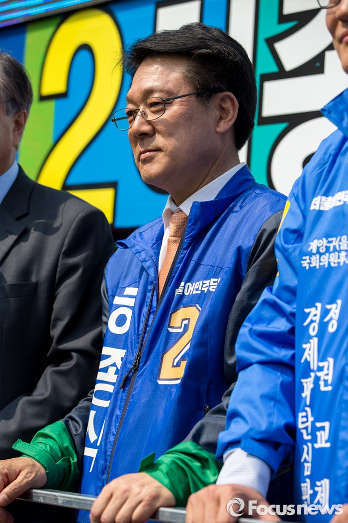 (인천=포커스뉴스) 허종식 더불어민주당 인천광역시 남구갑 후보가 7일 오후 인천광역시 지하철1호선 주안역 남광장에서 열린 인천 지역 합동유세에 참석 하고 있다.
