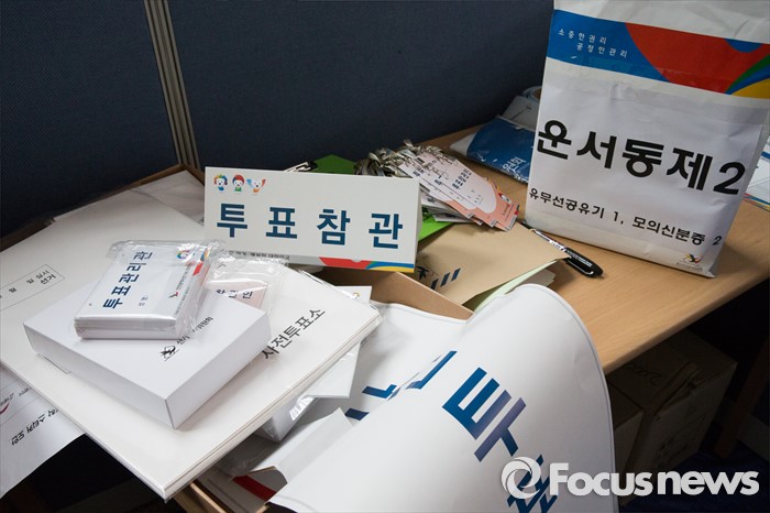 (인천공항=포커스뉴스) 제20대 국회의원 선거 사전투표를 하루 앞둔 7일 오후 인천국제공항 출국장에 사전투표소 설치 용품들이 놓여져 있다.