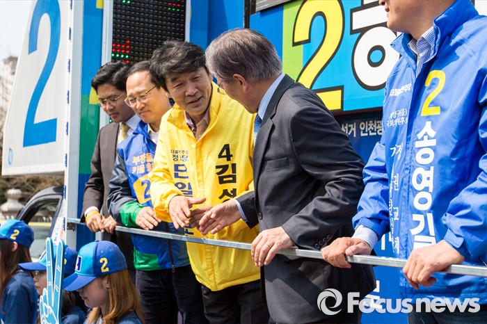 (인천=포커스뉴스) 문재인 더불어민주당 전 대표가 7일 오후 인천광역시 지하철1호선 주안역 남광장에서 김성진 정의당 인천광역시 남구을 후보와 악수 하고 있다.