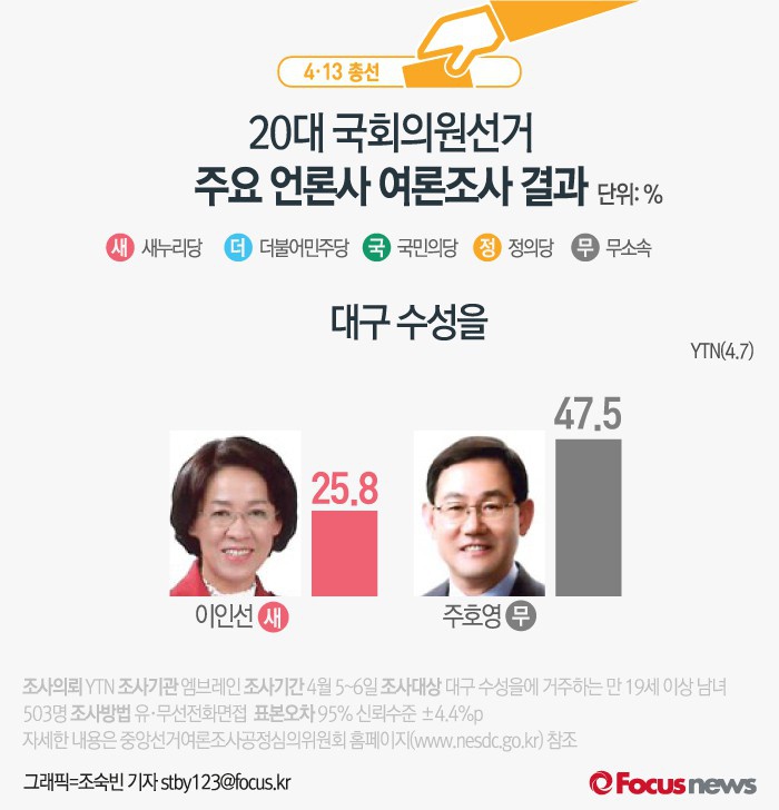 (서울=포커스뉴스) 4·13 총선이 얼마 남지 않았습니다. 총선 여론조사 결과 마지막 공표일인 오늘도 각 지역구별로 엎치락 뒤치락 하는 판세인데요. 각 언론사에서 실시한 주요 지역구 여론조사 결과를 살펴 보시죠. 이번에 보실 지역은 대구광역시 선거구입니다.