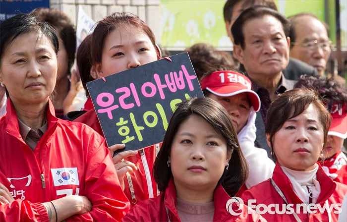 (서울=포커스뉴스) 7일 오후 서울 성북구 장위시장 앞에서 열린 김효재 새누리당 성북구을 후보 지원유세에 참석한 김 후보의 딸과 아내 등 가족들이 응원을 보내고 있다.