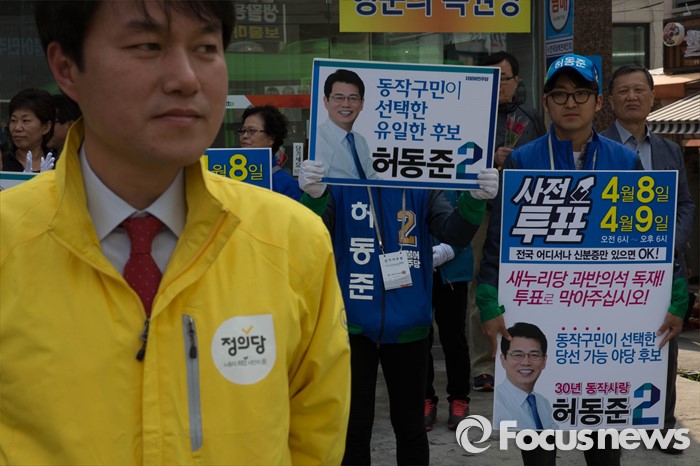 (서울=포커스뉴스) 20대 총선을 6일 앞둔 7일 오후 서울 동작구 남성역 골목시장 인근에서 허동준 더불어민주당 동작구을 후보측이 선거유세를 하고 있다.
