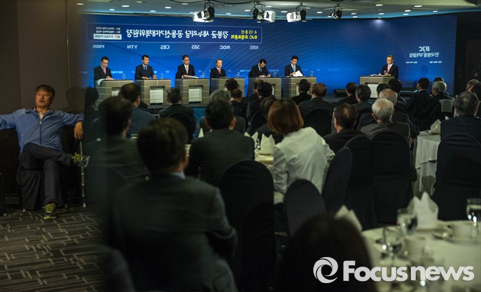 (서울=포커스뉴스) 7일 오후 서울 종로구 세종문화회관에서 열린 한국방송기자클럽 초청토론회에 참석한 강봉균(오른쪽 네번째) 새누리당 공동선거대책위원장이 패널들과 토론을 하고 있다.