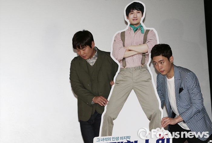 (서울=포커스뉴스) 7일 오후 서울 광진구 건대입구 롯데시네마에서 열린 영화 '위대한 소원' 언론시사회에 참석한 배우 안재홍(왼쪽)과 김동영이 최근 군에 입대한 배우 류덕환의 등신대를 운반하고 있다.