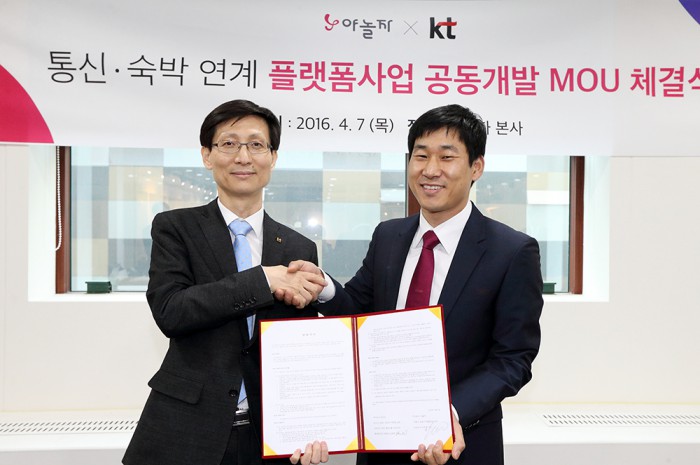(서울=포커스뉴스) KT와 숙박 O2O(Online to Offline)기업 야놀자가 통신과 숙박을 결합한 신규 플랫폼사업 공동개발을 위해 손잡았다. 양사는 7일 서울시 강남구 테헤란로에 위치한 야놀자 본사에서 관광 및 숙박 산업분야에서 비콘 중심의 사물인터넷(IoT) 기술과 O2O 마케팅, 빅데이터 등의 개발을 위한 양해각서(MOU)를 체결했다.