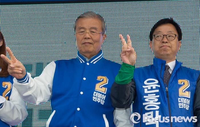 (충주=포커스뉴스) 김종인 더불어민주당 대표가 7일 오후 충북 충주 중앙로에서 지원유세를 나와 윤홍락 후보 지지를 호소하고 있다.