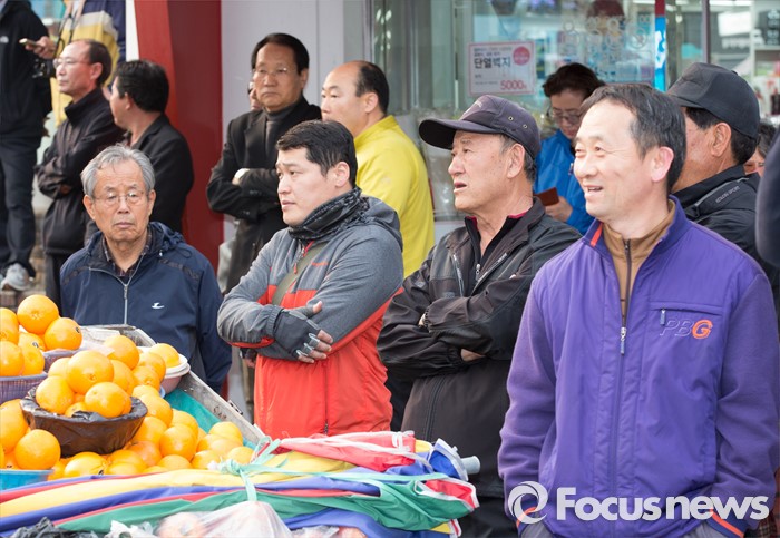 (충주=포커스뉴스) 7일 오후 충북 충주 중앙로에서 시민들이 김종민 더불어민주당 대표가 윤홍락 후보의 지지를 호소를 바라보고 있다.
