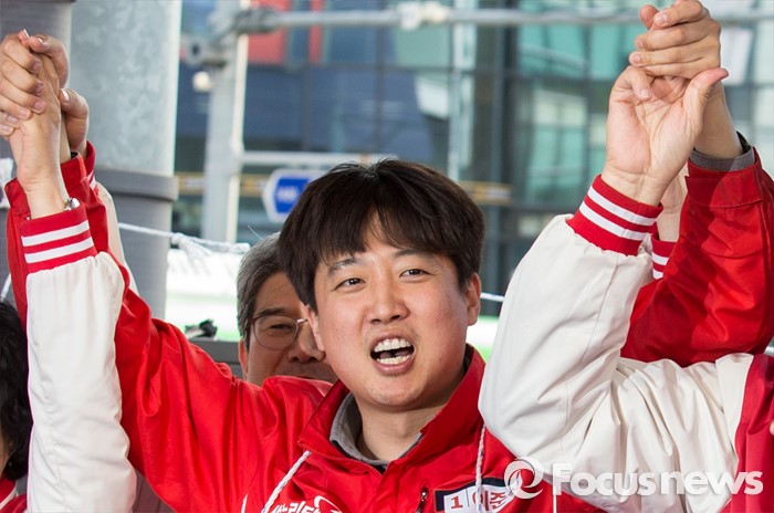 (서울=포커스뉴스) 7일 오후 서울 노원구 롯데백화점 인근에서 이준석 새누리당 노원구병 후보 지원유세에서 이 후보가 두 손을 들고 있다.