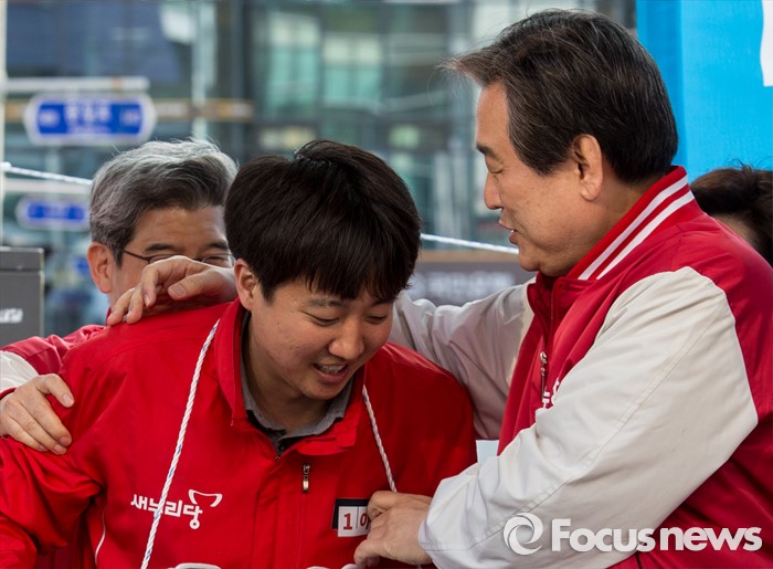 (서울=포커스뉴스) 7일 오후 서울 노원구 롯데백화점 인근에서 이준석 새누리당 노원구병 후보 지원유세에 나선 김무성 대표가 이 후보를 격려하고 있다.